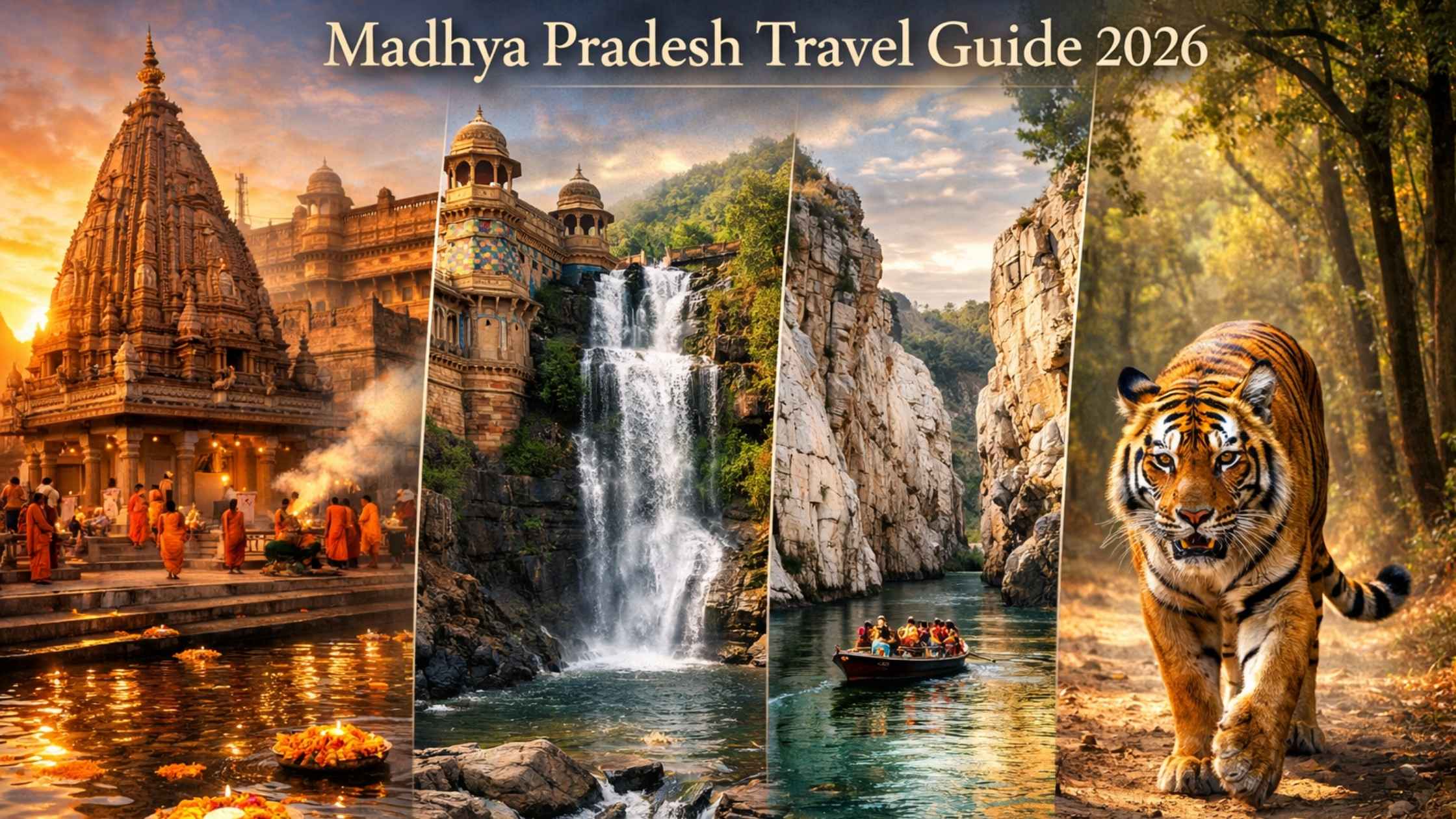 Madhya Pradesh is not one destination — it’s an entire world compressed into a single state. The sacred ghats of Ujjain at 4 AM. The ceramic-tiled palace of Gwalior Fort glinting in the afternoon sun. The mist rising above Bee Falls in Pachmarhi’s teak forest. The marble gorge at Jabalpur glowing silver under moonlight. A tiger crossing a dusty track in Pench as the forest holds its breath.